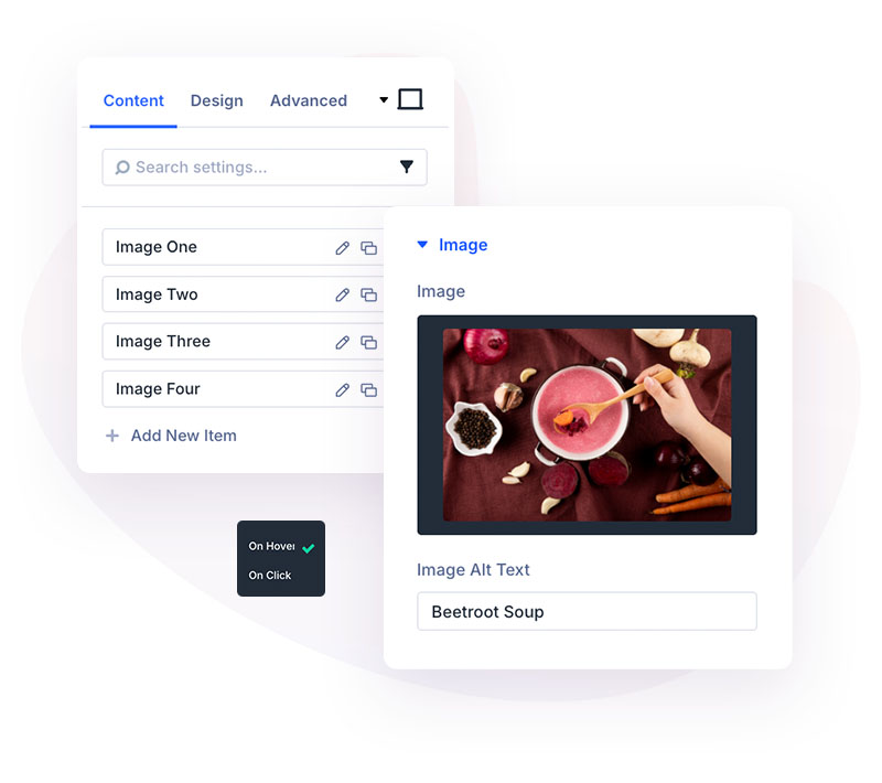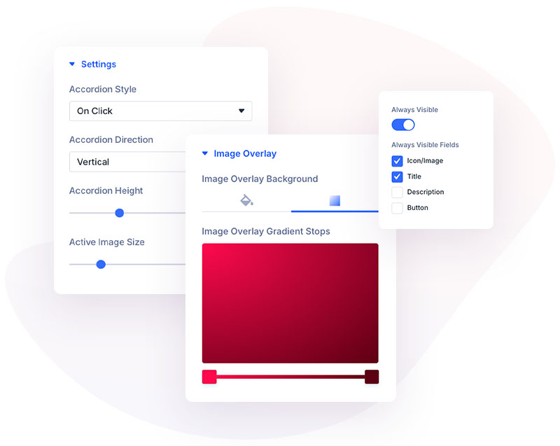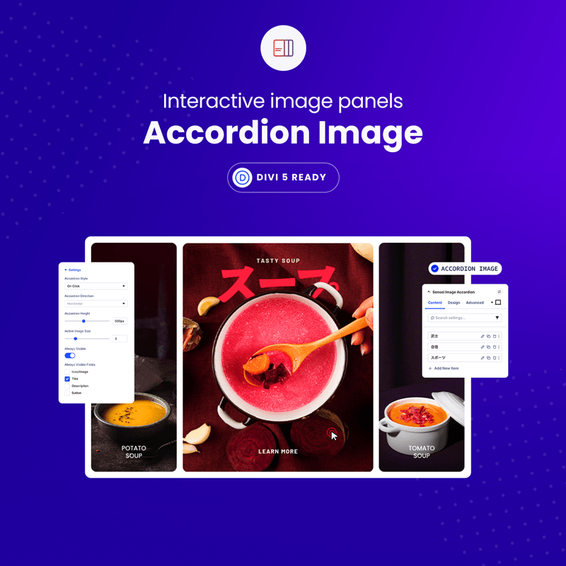 Create interactive image galleries with the Divi Sensei Image Accordion module. Add images and content to expand them with accordion animation effect on mouse click or hover.
